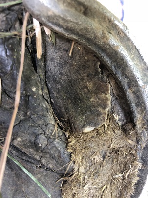 Detta är inget akut problem, men med för mycket material som fastnar under en lös flik av sulhorn kan problem uppstå och rekommendationen är att rensa bort allt löst sulhorn med en hovkniv, utan att skära i onödan i den friska sulan. Själv åker jag ut nästa arbetsdag för att åtgärda detta, men säkert kan många hästägare själva göra samma insats.